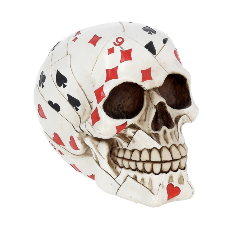 With a a wily, devilish grin that lingers, this skull gazes forward, adorned with a multitude of playing cards; each displaying different suits and numbers.