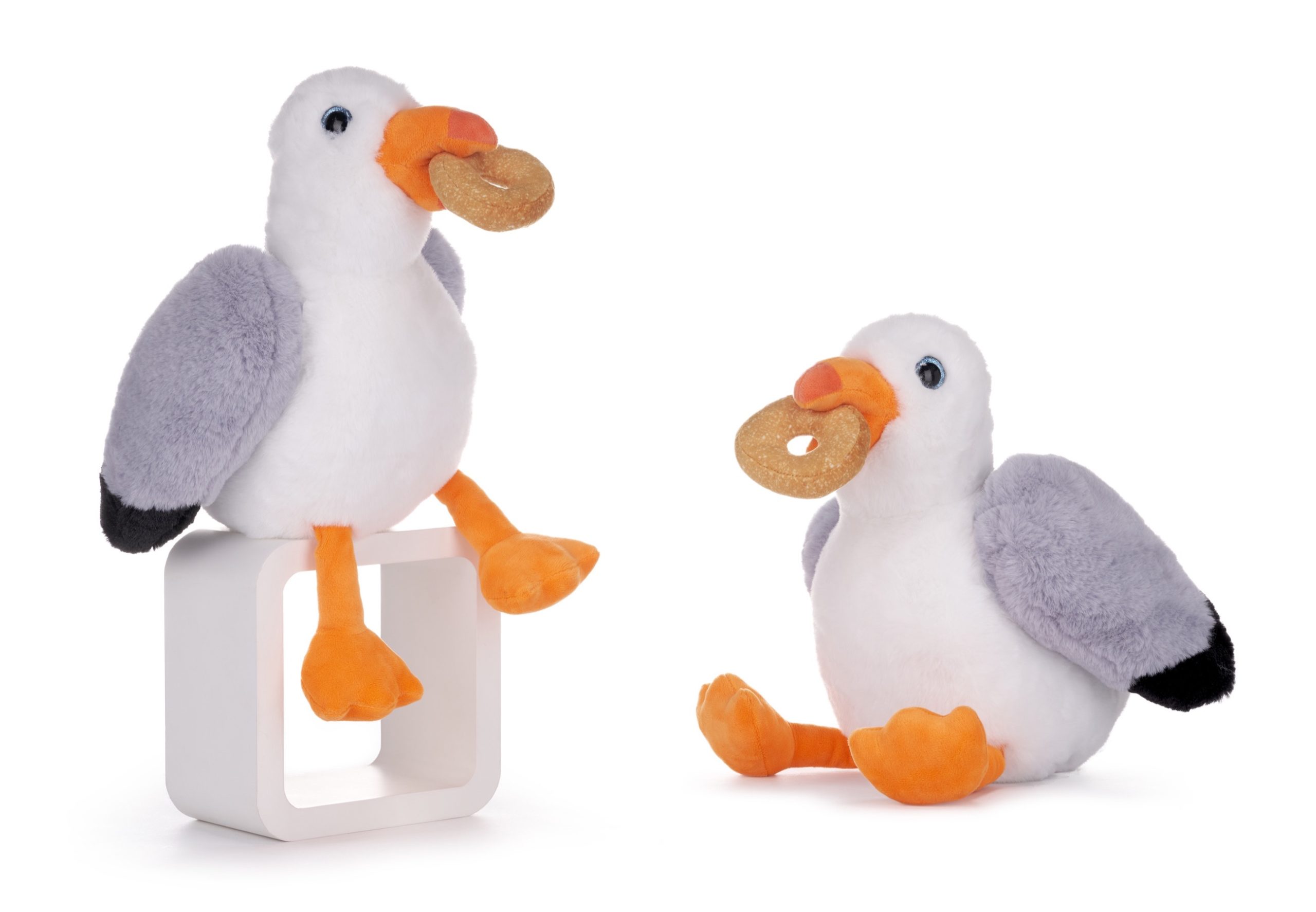 This cheeky, super soft plush is the perfect reminder of those beach days, featuring a delightful grey and white seagull with a Steven Seagull with Doughnut playfully tucked in his beak. Standing at 28 cm (11”) tall, Steven captures all the fun and mischief of seaside visits, where seagulls are always on the lookout for a tasty treat.